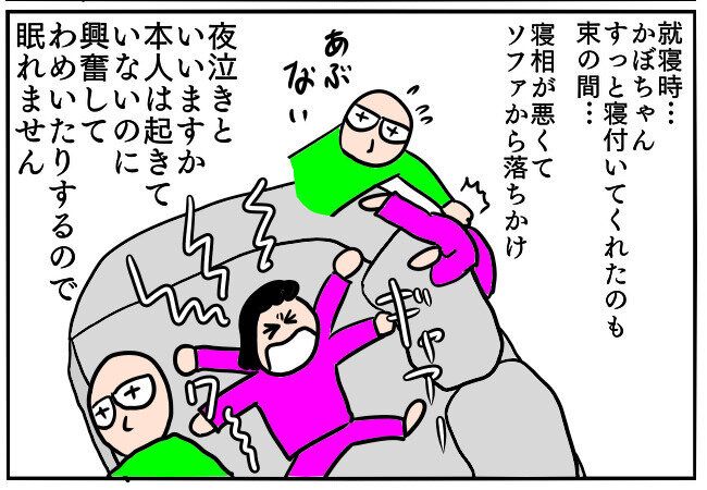 寝相が悪くて寝ていたソファから落ちかけたり、起きてはいないけれど夜泣きのように興奮してわめいたりと、かぼちゃんの対応に追われてなかなか寝られません。
