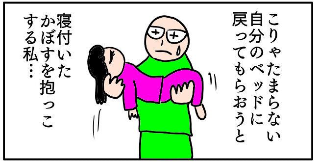 「これはたまらない」と自分のベッドに戻ってもらうため、かぼちゃんを抱っこしますが……。