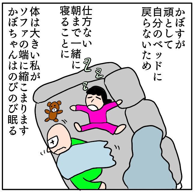 仕方ないとあきらめて朝まで一緒に寝ることにしましたが、体をのびのびと伸ばして眠るかぼちゃんに対し、体の大きいゆうじろうさんは縮こまって眠るのでした。
