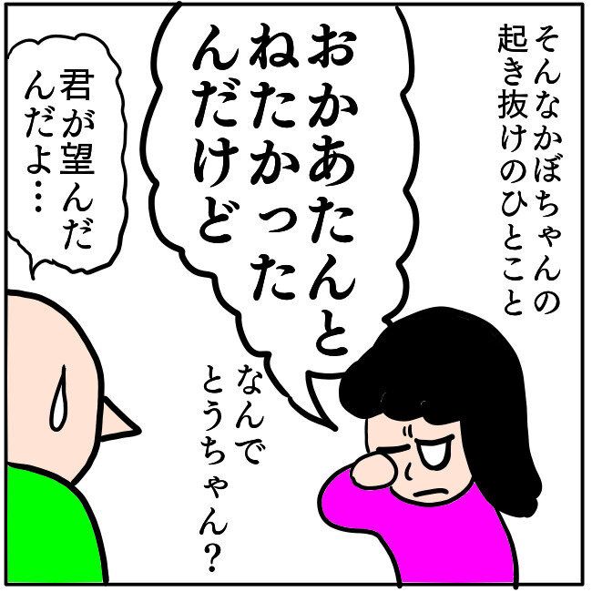 そしてようやく明けた苦労の一晩。起き抜けのかぼちゃんからは衝撃の一言が待っていました。