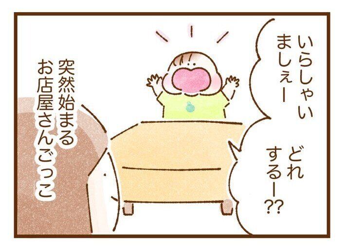 いよかん@3/1書籍発売「双子育児、ちょっぴり詰んでます!」さん(@k_iyokan)が「2歳児のお店屋さんごっこ」と題して育児漫画をツイートしました。2歳ならではの一風変わったかわいらしいお店屋さんにたくさんのいいねが集まっています。