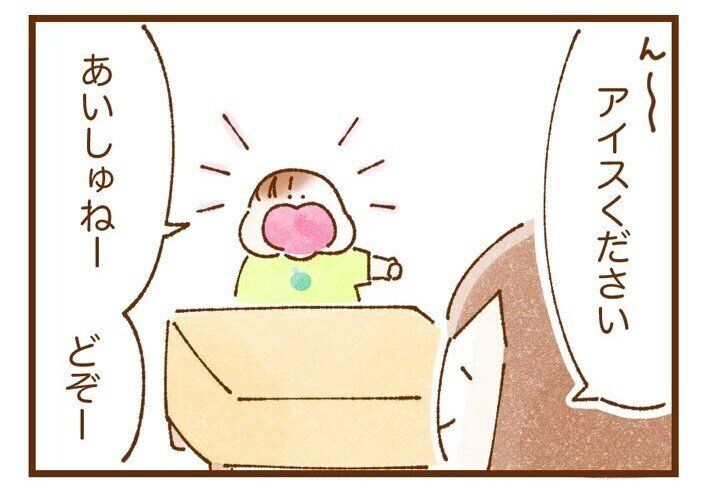 いよかんさんがお客さん役となり「アイスください」と注文すると、「あいしゅねー どぞー」と、すぐに商品が出てきました。