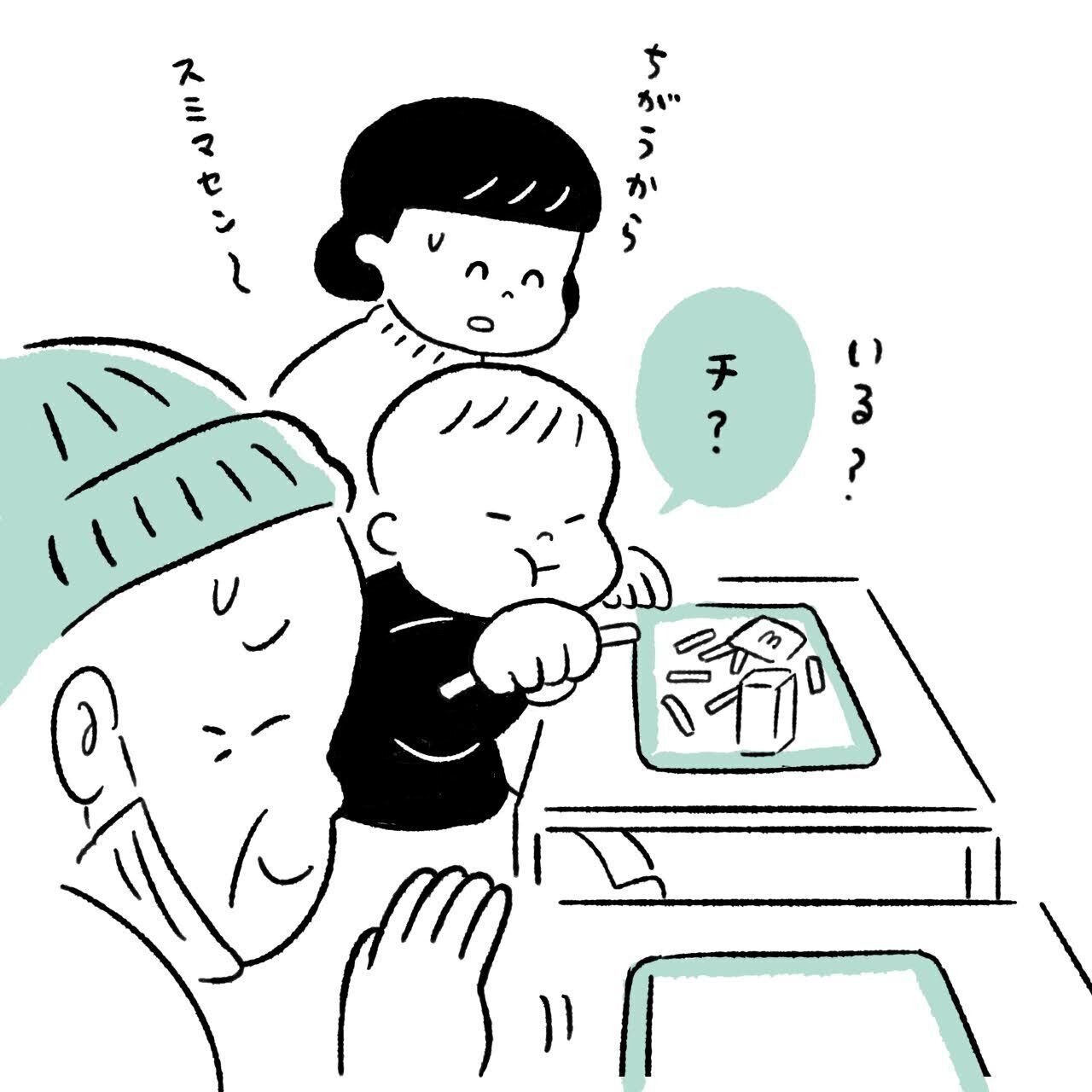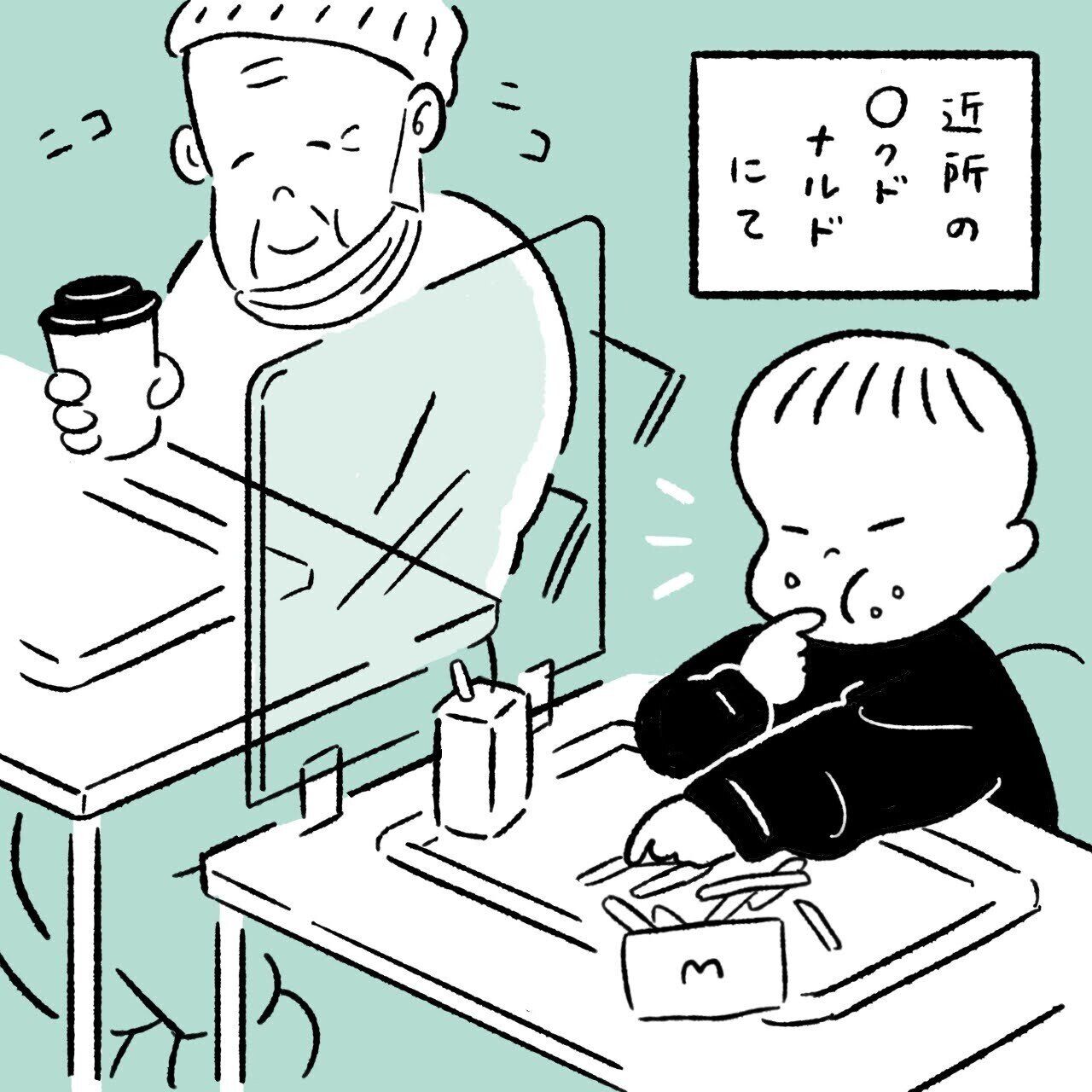 おじいちゃんの視線に気づき、「チ?」(いる?)とポテトを差し出す息子さん。