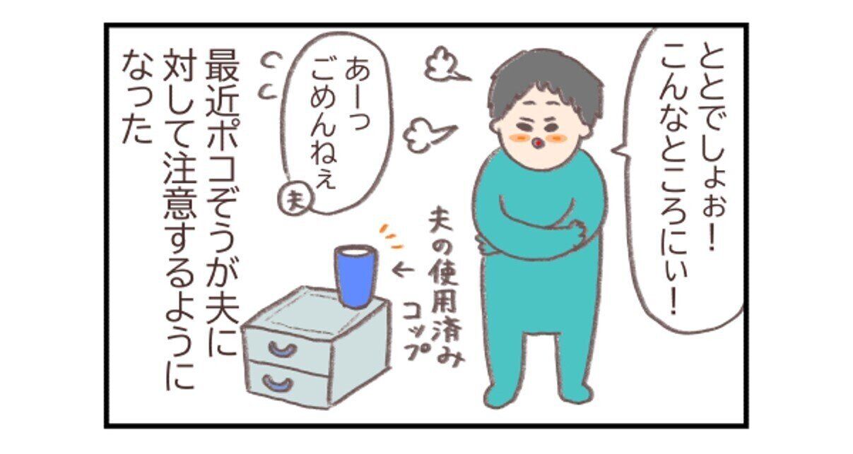 息子のポコぞうくん!使用ずみのコップを出しっぱなしにしていた夫さんに注意をしてくれています。