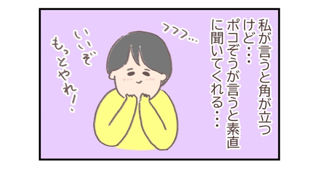 それを見ているぽよさんは「ふふふ…」。自分が注意するよりも、子が言ってくれた方が話がとおる、というのはあるあるですよね。