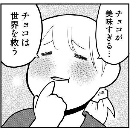 あまりのおいしさに頬を染め、「チョコがうますぎる…チョコは世界を救う」とチョコへの賛辞をつぶやきます。