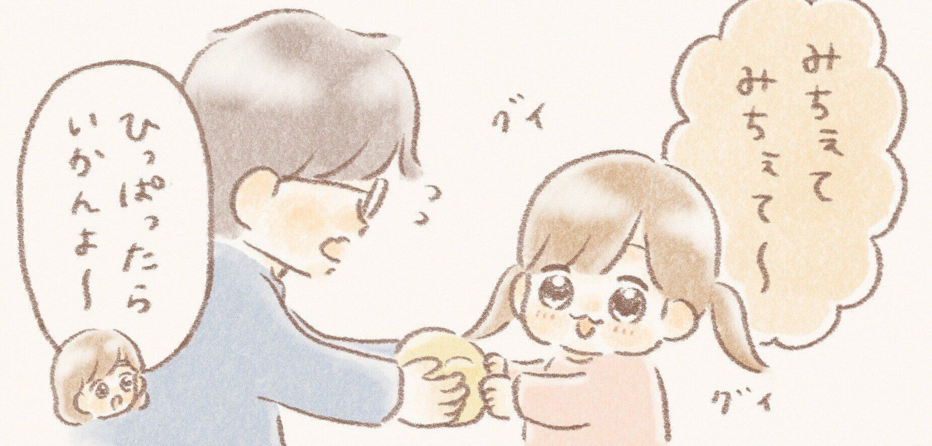 うにちゃんは「みちぇてみちぇて~(見せて見せて~)」と言いながら貯金箱をグイグイ引っ張りますが、パパはその勢いに慌てている様子。