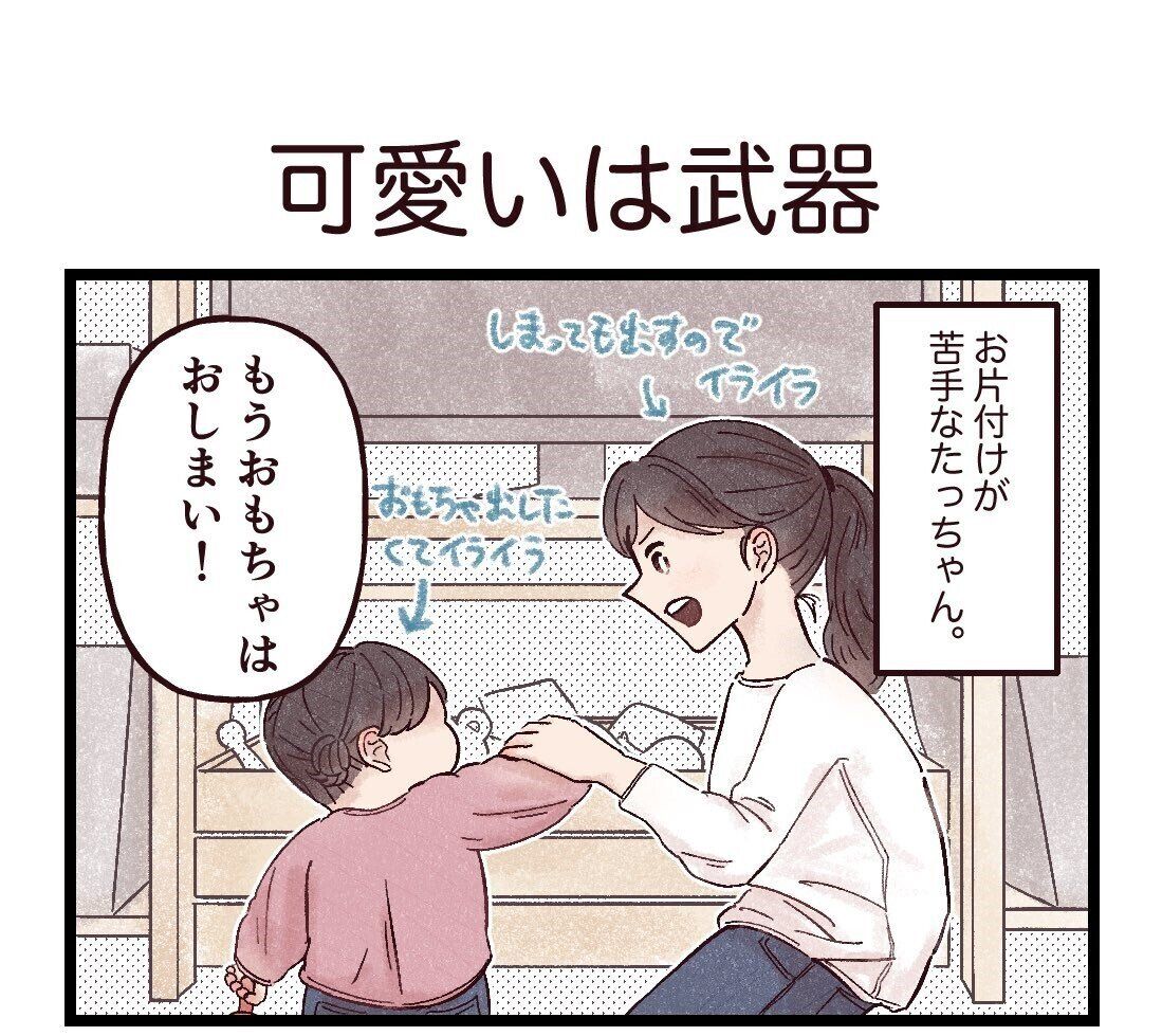 たすこ2yさん(@mmtsk92)が「かわいいは武器」というタイトルで育児漫画をツイートしました。お片付けをせず叱られてしまった2歳の娘さん。しかしその後ママのご機嫌をうかがう様子がかわいすぎて、ママも思わずキュンとしてしまうのでした。