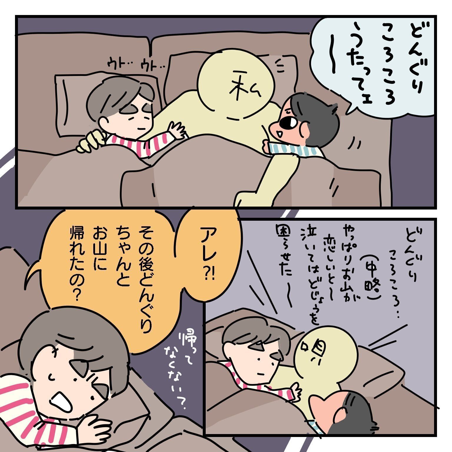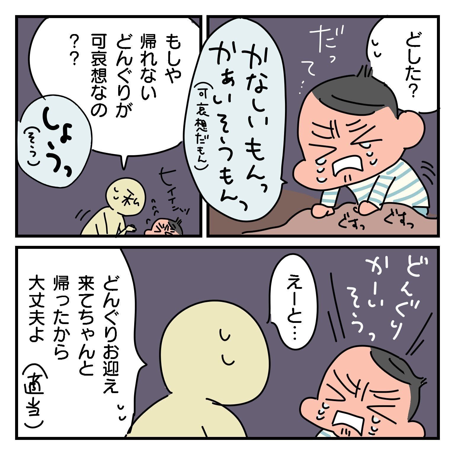 それは驚きますね!どんぐりがお山に帰れないという結末は、息子さんにとって心から悲しい出来事だったのかもしれません。