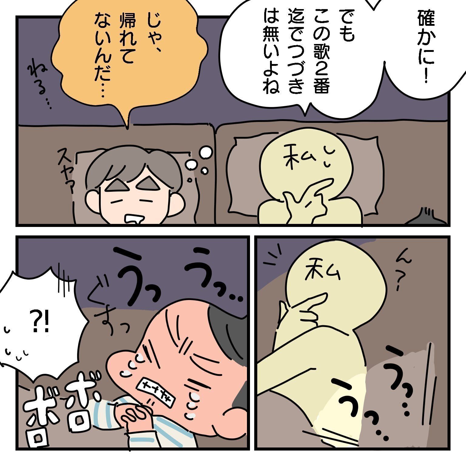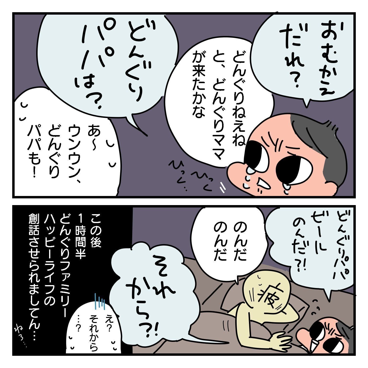 たぬポンドさんの「お迎えが来た」という言葉から、「どんぐりころころ」のエピソードがハッピーエンドに!最後には「どんぐりパパがビールを飲んだ」という楽しいお話に変わっていきました。