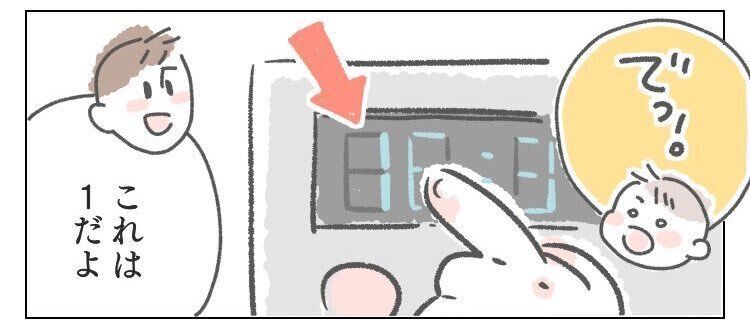 リモコンに表示された数字を指さし、「でっ!」と言うあーくんに、パパは「これは1だよ」と答えます。