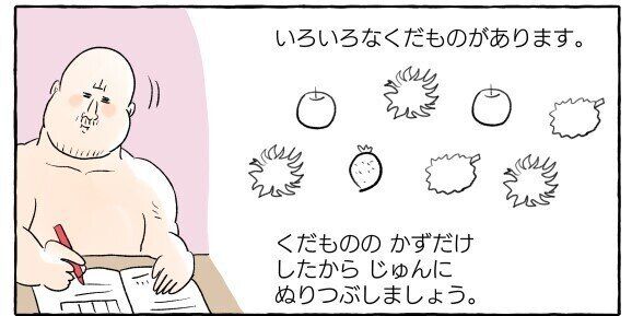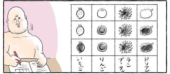 赤ペンを持ったヤマモトさんが答えを確かめると、そこには問題にしたがってぬりつぶされた果物たちが。