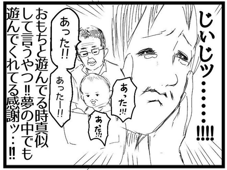 「あった!」はなんと、じいじの寝言でした。しかもおもちくんと遊んでいるときの言葉。感謝に震えるもうもうさんなのでした。