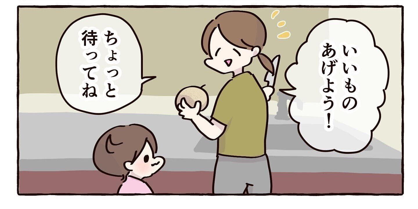 「いいものあげよう!」と、何気なくお子さんに話しかけ、梨の皮をむいてあげています。