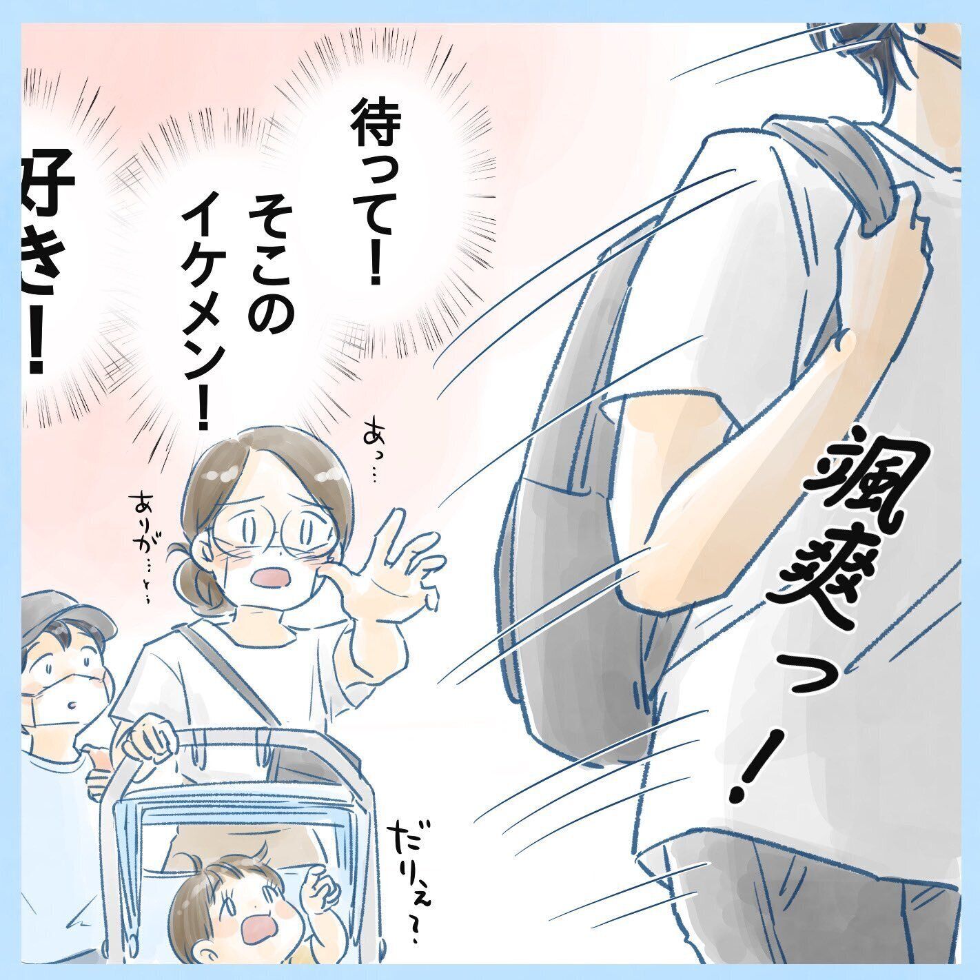 「このご時世ですから、思わずベビーカーに手で触れたことを後悔して、颯爽と立ち去ったのかもしれません。でも、さりげない手助けができるのは、普段から当たり前にそういう意識と行動をしている方だからだろうと思います。素敵な人に出会えて、嬉しい気持ちになりました!」
