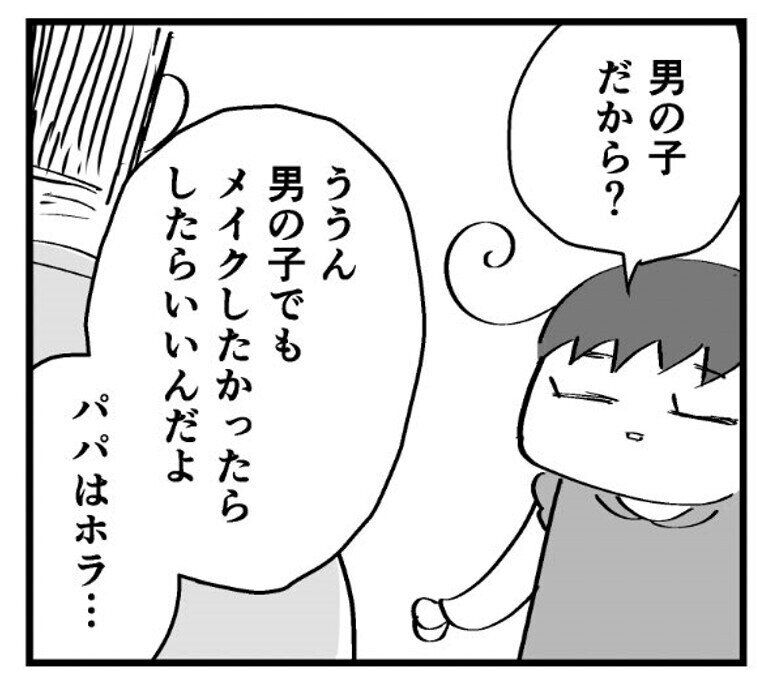 娘ちゃんは「男の子だから?」と訊ねます。この問いに対してパパは「男の子でもメイクしたかったらしたらいい」と言ったうえで、こう付け加えました。
