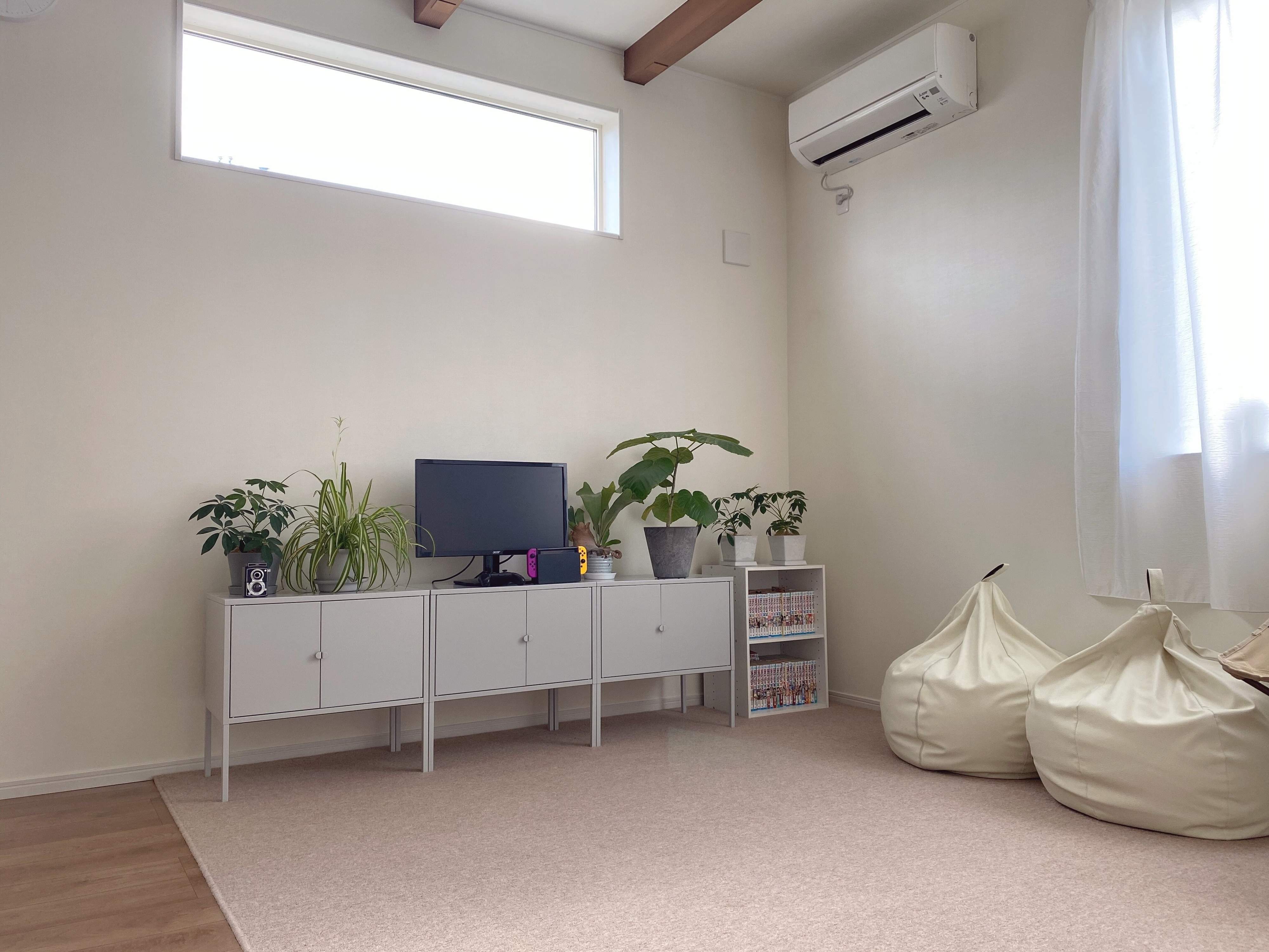 ゲームモニターとして小さなモニターはありますが、子ども部屋に置くこともあり移動させるので、リビングにないときはスッキリとして開放的です。