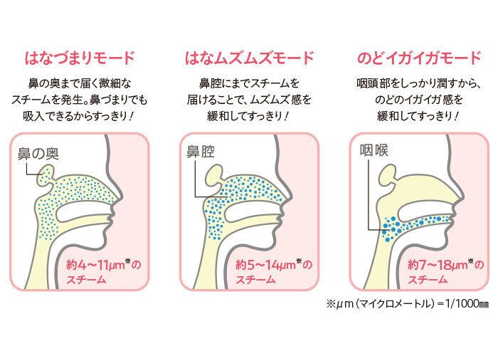 「スチームの粒の大きさまで調節できるんですね」と、足立さんが注目したのが、悩みに合わせて選べる3つのモードです。のどのイガイガ感や鼻づまりなど、悩みや体調に合わせて手軽に使い分けができるので1年中活躍しそう。