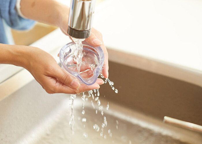 吸入マスクなどは取りはずして、サッと水洗いをすればOK。台所用中性洗剤を薄めてぬるま湯などで洗えば、さらに清潔に使えます。「お手入れが簡単で、いつでも清潔に使えるのがうれしいですね」と足立さん。