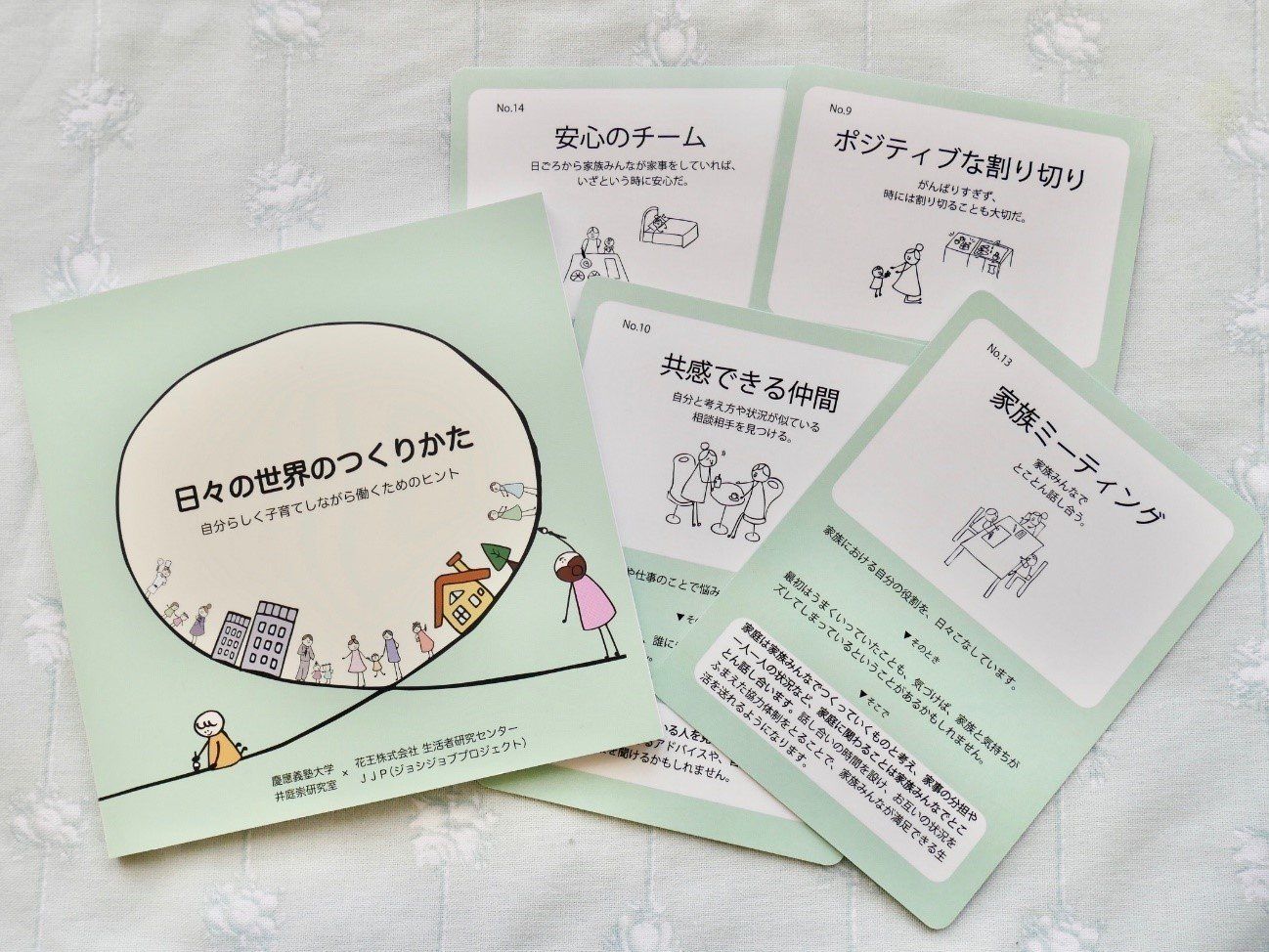 「育児と仕事をうまく両立している諸先輩がたの工夫やコツが詰まったヒント集をバイブルにしています。花王株式会社 生活者研究センターと慶應義塾大学SFC研究所 井庭崇研究室が共同制作したパターン・ランゲージ『日々の世界のつくりかた~自分らしく子育てしながら働くためのヒント~』という、育児と仕事の工夫をまとめた冊子とカードです。