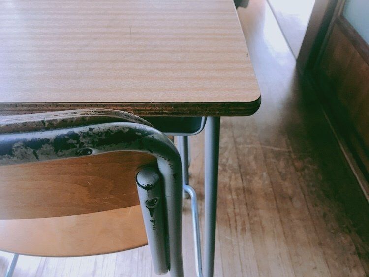 教室は、庭が眺められる縁側の窓際。そこに机と椅子を移動しました。明るく開放感ある場所が良いかなぁとこの場所に決定。ちなみにコレ、学校で使われている机と椅子と同じモノなんです。このセットを購入したときには、よもやワタシが「おウチ学校」を開校することになるとは思ってもいませんでしたが。