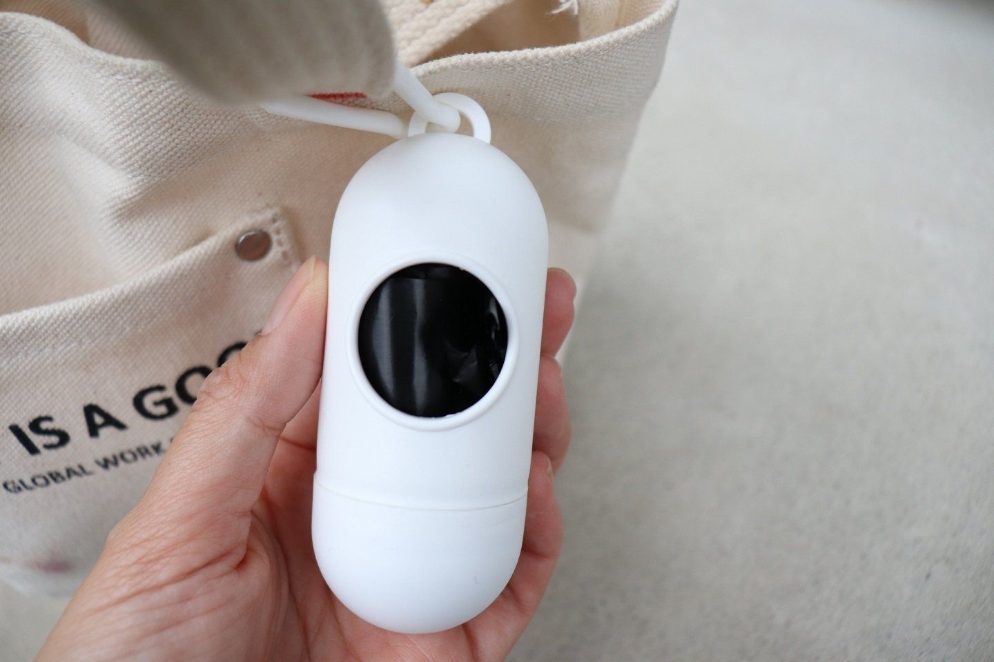 今回ご紹介するキャンドゥの「ゴミ袋携帯ケース」。写真のとおり、バックなどに直接ぶら下げられるようになっています。色も白とシンプルなので、バックのデザインを邪魔しない!この丸い穴からシュッとゴミ袋が出てきますよ。
