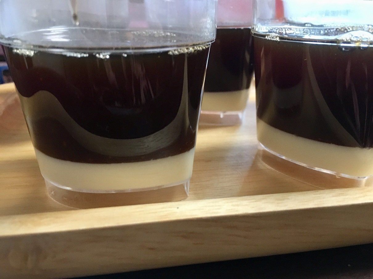 今回は豆乳とコーヒーの2層ゼリーをつくることに。カップには耐熱性もあるので、温めてゼラチンを入れたコーヒーを注いでも大丈夫。豆乳の白い部分だけ最初に入れて冷やした後、固まったら次はコーヒーを入れて冷やします。