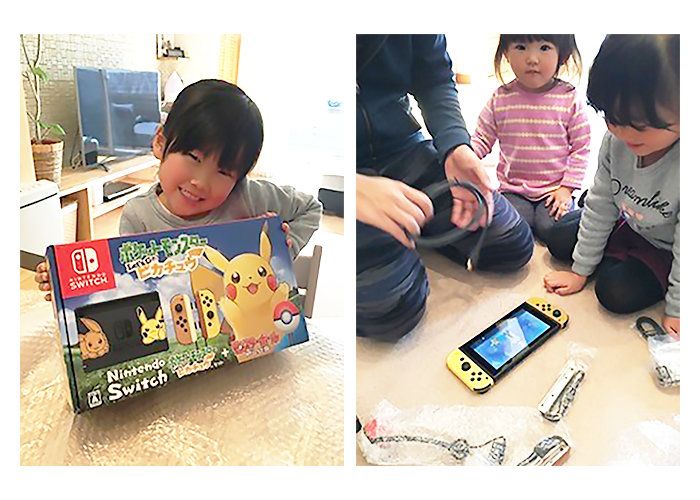 「わが家が体験する初めてのゲーム『ポケットモンスター Let’s Go! ピカチュウ・Let’s Go! イーブイ』。まずは、包装された袋からNintendo Switchとともにゲームを取り出すとニコニコの娘たち。すぐに箱に描かれたピカチュウに反応して、『ピカチュウだ!』。とってもうれしそうで興味津々」