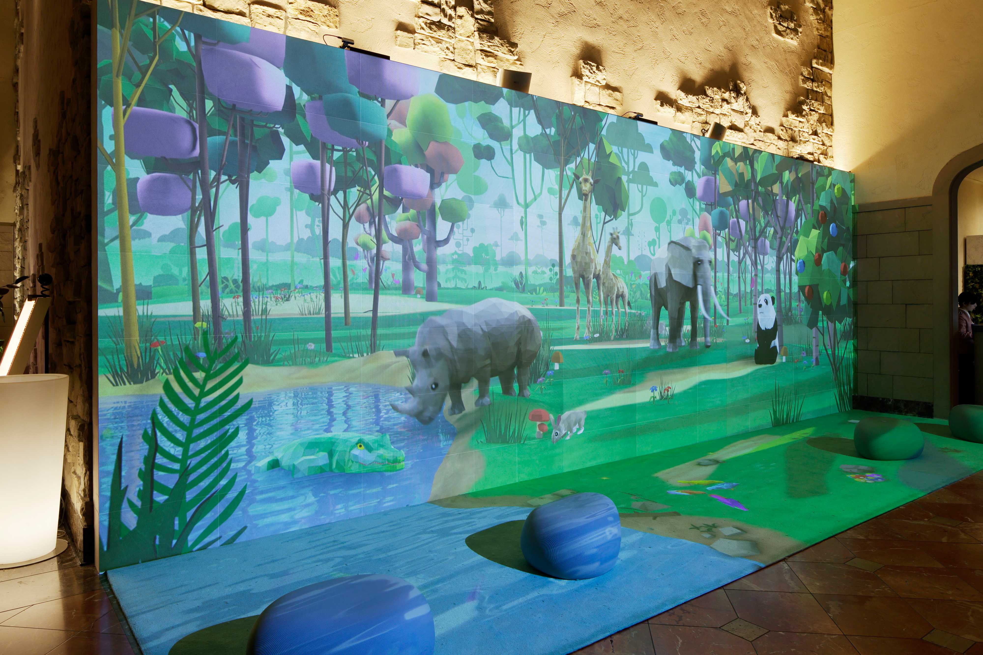 ロビーの壁面を舞台に繰り広げられる森の中では、草花がささやきあい、動物たちが生き生きと動き回ります。人の動きに反応して映像が変化するので、子どもも大人も大盛り上がり!