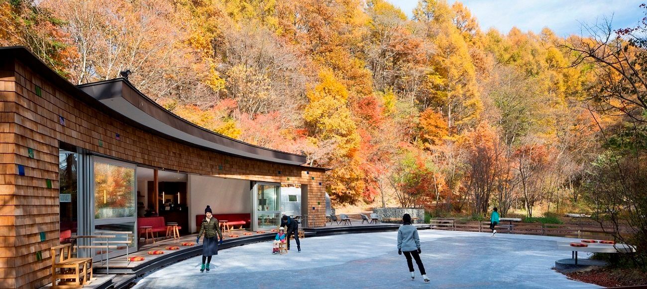 紅葉の季節から楽しめるアイススケート場。紅葉シーズンは人工エリアのみ、本格的な冬になると天然氷エリアも結氷し、滑走エリアが広がります。周辺にはレストランやお店が連なる「ハルニレテラス」や、「星野温泉トンボの湯」など、様々な施設が揃っています。