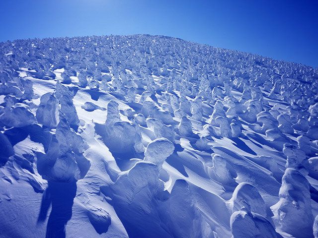 山形県、蔵王温泉スキー場の山頂部で見られる樹氷は、別名「スノーモンスター」とも呼ばれ、その奇異な風景が世界的に知られています。
