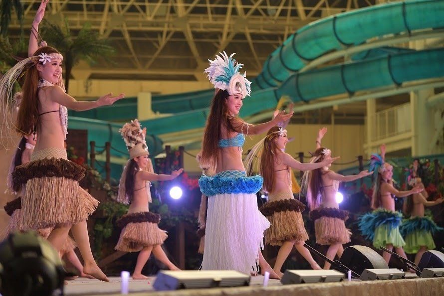ここは、映画「フラガール」の舞台になったことでも知られています。スパリゾートハワイアンズの魅力のひとつでもある、ハワイアンショーが開催されるのも、このエリア。屋内のプールに囲まれた特設ステージで、フラガールやポリネシアンダンサーたちが、本場さながらのステージを披露します。