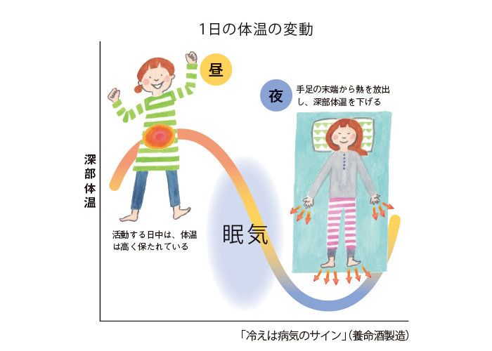 養命酒製造アドバイザー(以下、養命酒):もしかして、手足の先や体全体が冷えているのでは? 実は冷えと睡眠には関係があるんですよ。人間は、起床とともに体温が上がり、夜になると下がるようになっています。だから、睡眠のためには、体にたまった熱(深部体温)を下げる必要があるのですが、冷え症の人はそれがうまくできないんです。