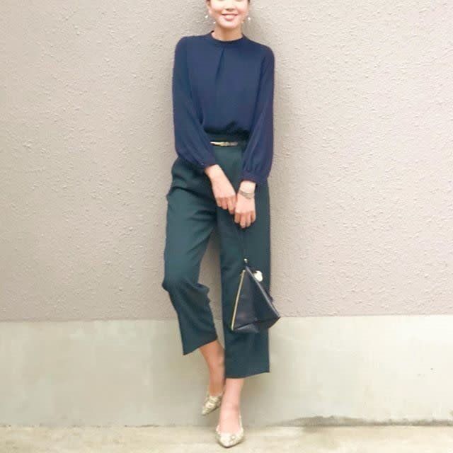 スーツではお堅いイメージになりすぎ、というときに使えるのが、えり元がきちんとしたデザインのブラウスとテーパードパンツ。