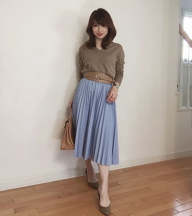 トレンド要素のある、カラープリーツスカートも、トップスをベーシックカラーにすれば品のある、きれいめママスタイルになりますよ。さらにベルトでウエストマークをすれば、おしゃれテクニックのある、一目置かれる存在に。