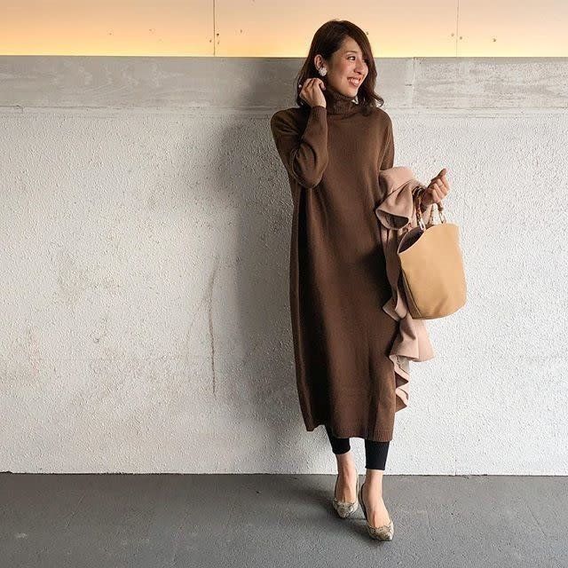 トレンド要素の高いレギンスやニットワンピ―スも、同系色で落ち着いたものなら安心。教室でも浮かないおしゃれなママスタイルになりますよ。