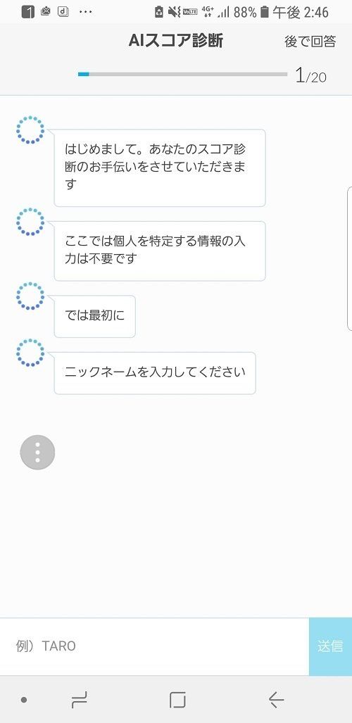 AIスコアを算出するには、スマホから簡単な質問に答えていくだけ。生まれた年、月、年収などにチャット形式で答えていくと、2分もかからず算出できて、忙しいママにとってうれしいかぎりですよね。