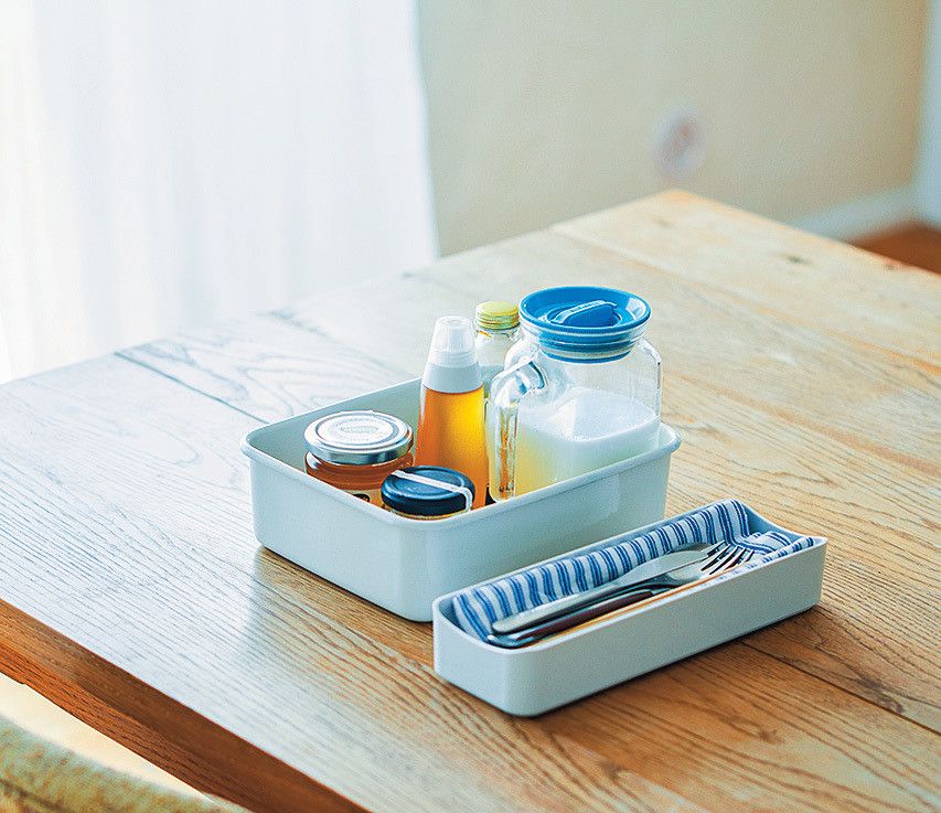 パン派ならジャムやバター、カトラリーなど、毎朝使うものをひとまとめに。ケースごと運ぶだけなら、子どもでも簡単。忙しい朝の作業が軽減します