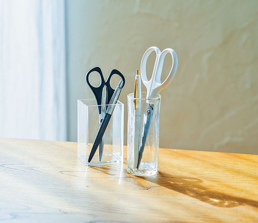 よく使うハサミとペンは、1カ所だけだといちいち取りに行くのが面倒。キッチン、リビング、玄関など、家中に置いておけば、家族がすぐ使えて作業がスムーズに