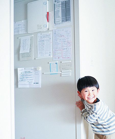 長男の幼稚園の持ち物やバスの時刻表など、何度も聞かれがちなことは廊下の壁に集約。目につく場所だから、いちいち言う手間もなし!