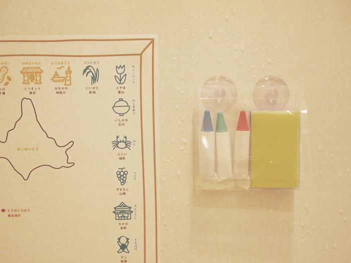先ほどのお風呂ポスターには絵も描けちゃいます!描いて消せる「おふろポスター用 おえかきセット」。覚えたひらがなに丸をつけてみたり、字を書く練習をしてみたり…と、お風呂でもたくさんの遊びを親子で楽しむことができます。描いたものは付属のスポンジに軽く水をつけてサッと拭き取ることができます。