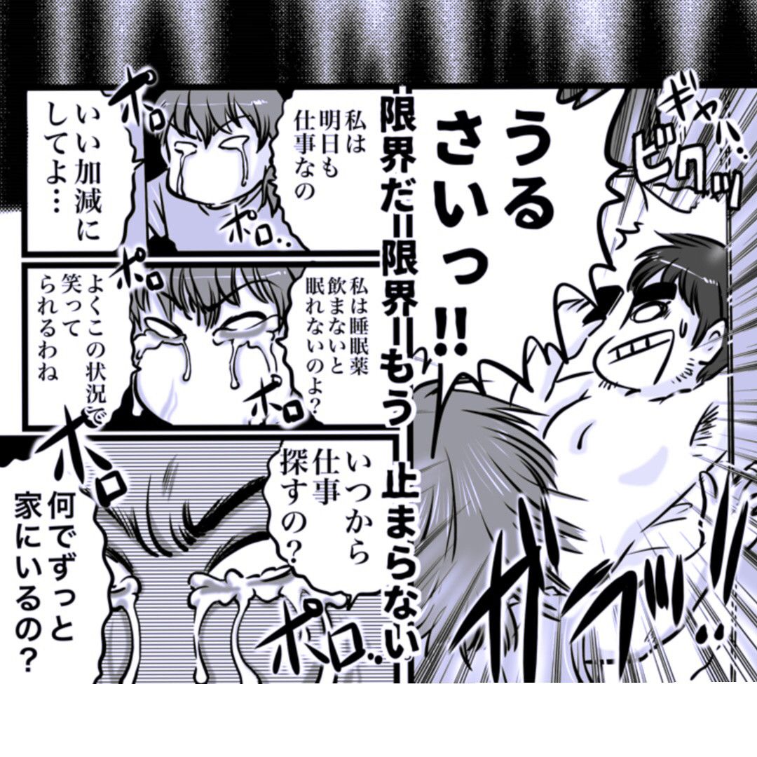 数か月我慢したあげく、妻は遂に爆発。妻が仕事・育児・家事をこなす間、職探しどころか家事のサポートすらしない夫にブチ切れてしまいました。感情が嗚咽とともに吹き出します。