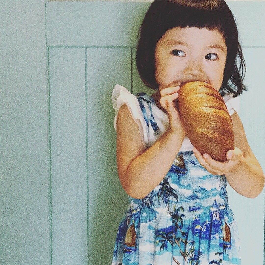 身の回りにあるちょっとした小物を使って撮影するのもおすすめ。例えばこの写真、子どもにあえて大きなパンを持ってもらい撮影したのだとか。顔の大きさほどもあるパンを両手で支えながらほおばる姿が、何とも子どもらしくて可愛い一枚!