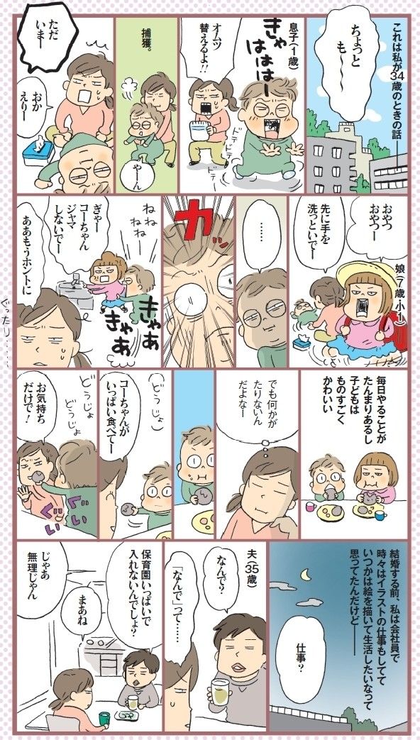印刷関連の会社を26 歳で結婚退職し、専業主婦に。27 歳で長女、33 歳で長男を出産後、34歳でまんが連載を開始、現在に至る。