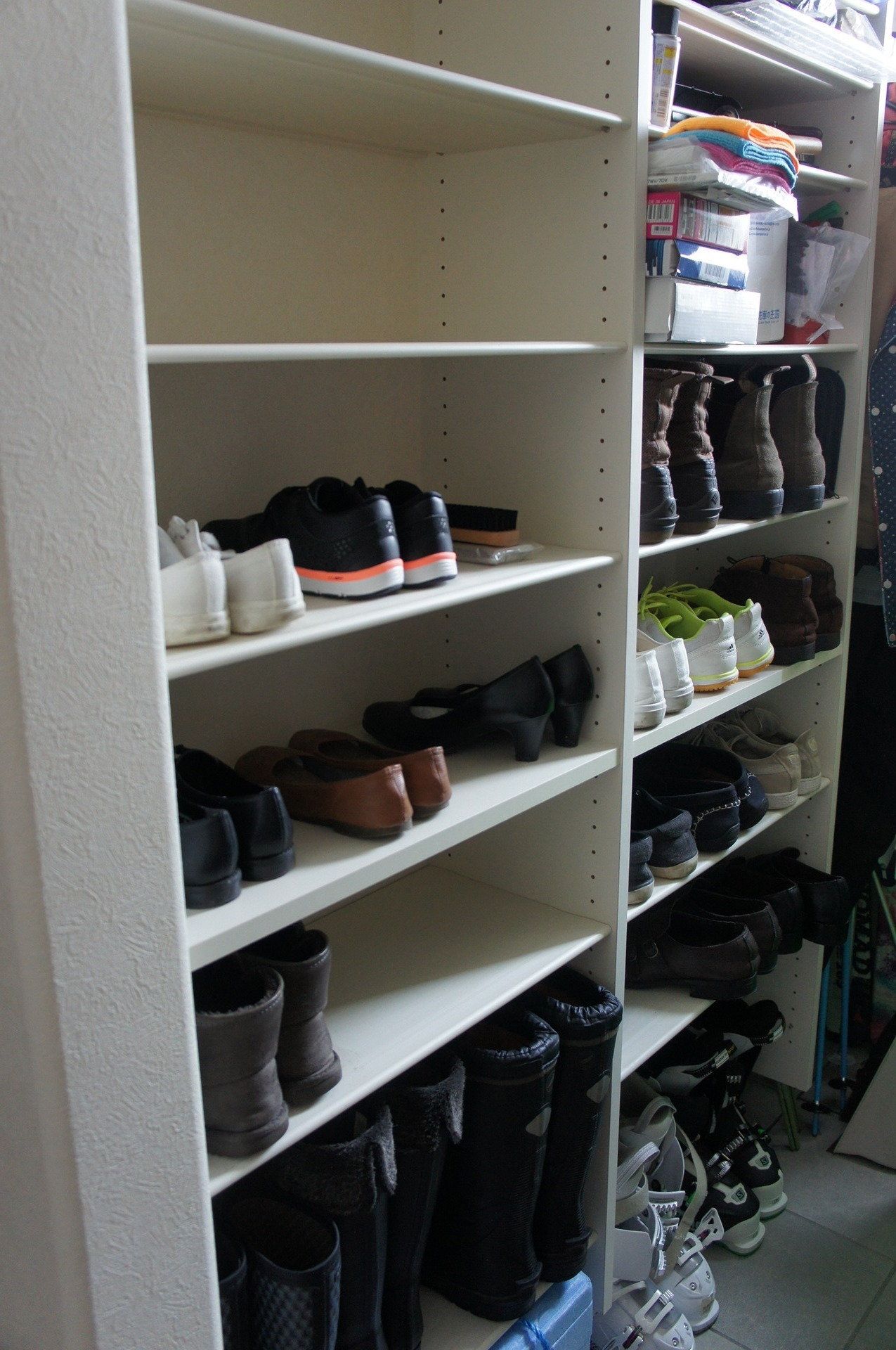 夫の私物など、靴以外のものが置かれていたシューズクローゼットを片づけたユッカさん。まず棚のものをすべて出して拭いたら、スキー用品や個人の靴などの必要なものと、用途のわからない工具やスプレーなど不必要なものとに分別。それから必要なものだけ収納し直すことで、玄関周りがスッキリして移動もしやすくなったのだとか!