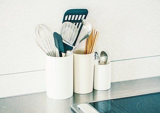 ▲水きりかごに入れっ放しにしがちなカトラリーや、よく使う調理器具はあえて出したままに。シンプルな容器に分類すれば見た目も◎