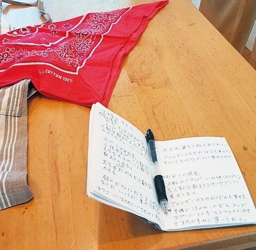 保育園パートの仕事メモと三角巾は頑張った証し。「つらかったけど、新人指導をサポートするなど経験を積めたことが救いです」