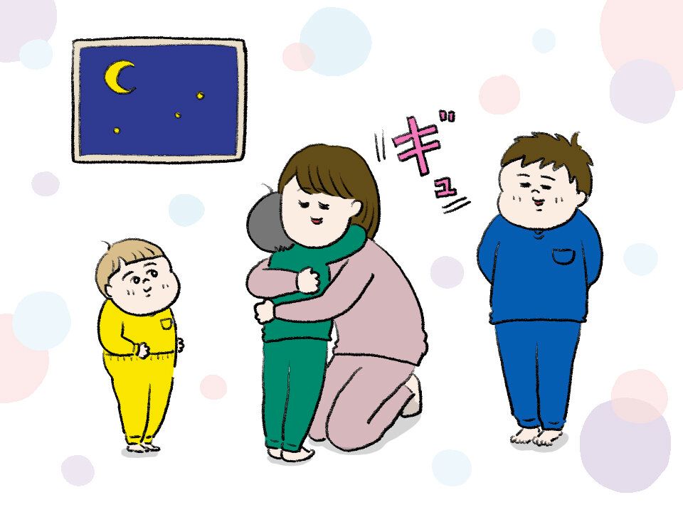 順番に2~5分、私が子どもを抱きしめます。相手が嫌になるまでギューって。ボソボソ話し出すことも。わが家のマスト行事です(笑)