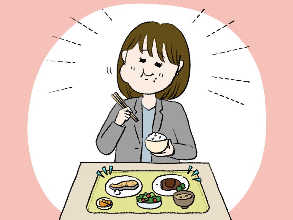 しっかり寝ること。ランチでびっくりするくらい食べます。社食で肉おかず、魚おかず、メインを2種頼んで完食。炭水化物少なめ、タンパク質多めの食事にしています。昼食は子どもに邪魔されず食べられる唯一の時間。自分でメインを2品作るのは大変だけど、ここなら作ってもらえるから、ここぞ!と満喫。