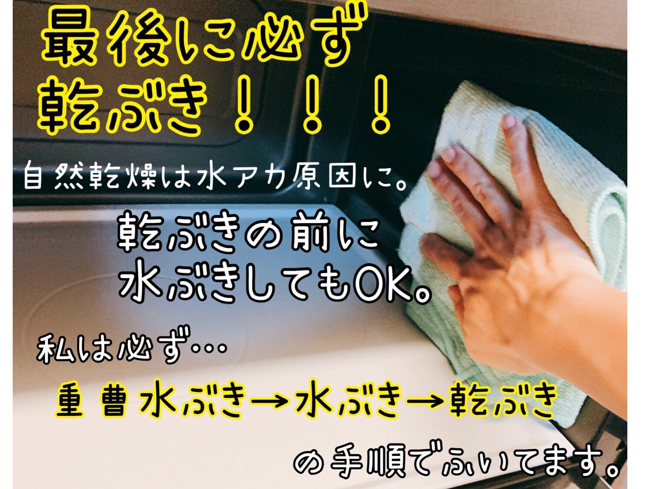 電子レンジ内をしっかり重曹水マイクロファイバークロスで拭いた後に、そのまま放置し、自然乾燥すると水アカの原因になります。最後は必ず乾拭きをしてください。